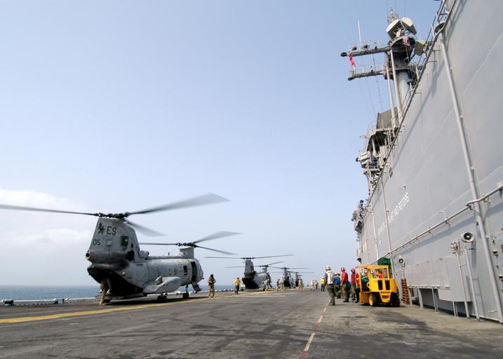 Keywords: US Navy 040724-N-6380E-045 The flight deck crew aboard the amphibious assault ship USS Wasp (LHD 1) welcomes back CH-46 Sea Knights helicopter assigned to the Fighting Griffins.jpg en Indian Ocean July 24 2004 - The flight deck crew aboard the amphibious assault ship USS Wasp LHD 1 welcomes back CH-46 Sea Knights helicopter assigned to the Fighting Griffins of Marine Helicopter Medium Squadron Two Six Six HMM-266 HMM-266 is the Aircraft Combat Element of the 22nd Marine Expeditionary Unit MEU Special Operations Capable as they return to the flight deck of the amphibious assault ship USS Wasp LHD 1 The 22nd MEU is part of the Wasp Expeditionary Strike Group two ESG-2 and are currently on deployment in support of Operation Iraqi Freedom OIF U S Navy photo by Photographer s Mate 3rd Class Teresa Ellison RELEASED 2004-07-24 040724-N-6380E-045 Navy http //www navy mil/view_image asp id 16833 U S Navy photo by Photographer s Mate 3rd Class Teresa Ellison PD-USGov-Military-Navy CH-46 Sea Knight USS Wasp LHD-1 flight deck |