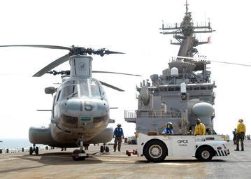 Keywords: US Navy 040724-N-6380E-081 A CH-46 Sea Knight helicopter assigned to the Fighting Griffins of Marine Helicopter Medium Squadron Two Six Six.jpg en Indian Ocean July 24 2004 - A CH-46 Sea Knight helicopter assigned to the Fighting Griffins of Marine Helicopter Medium Squadron Two Six Six HMM-266 is towed on the flight deck of the amphibious assault ship USS Wasp LHD 1 HMM-266 is the Aircraft Combat Element of the 22nd Marine Expeditionary Unit MEU Special Operations Capable as they return to the flight deck of the amphibious assault ship USS Wasp LHD 1 The 22nd MEU is part of the Wasp Expeditionary Strike Group two ESG-2 and are currently on deployment in support of Operation Iraqi Freedom OIF U S Navy photo by Photographer s Mate 3rd Class Teresa Ellison RELEASED 2004-07-24 040724-N-6380E-081 Navy http //www navy mil/view_image asp id 16836 U S Navy photo by Photographer s Mate 3rd Class Teresa Ellison PD-USGov-Military-Navy CH-46 US Marine Corps USS Wasp LHD-1 flight deck |