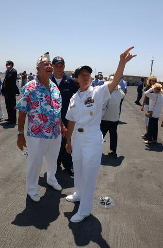 Keywords: US Navy 040811-N-4776G-071 USS Ronald Reagan (CVN 76) Command Master Chief Kathy Hansen gives a Pearl Harbor survivor a tour of the ship^rsquo,s flight deck.jpg en San Diego Calif Aug 11 2004 - USS Ronald Reagan CVN 76 Command Master Chief Kathy Hansen gives a Pearl Harbor survivor a tour of the ship s flight deck The guests were given a special tour of the Navy's newest nuclear powered aircraft carrier during a visit to present a World War II WWII book autographed by Pearl Harbor survivors to the ship s commanding officer The ship arrived in its new homeport of Naval Air Station North Island San Diego after participating in exercises in support of Summer Pulse 2004 U S Navy photo by Photographer's Mate Airman Kathleen Gorby RELEASED 2004-08-11 040811-N-4776G-071 Navy http //www navy mil/view_image asp id 17136 U S Navy photo by Photographer's Mate Airman Kathleen Gorby PD-USGov-Military-Navy Aircraft carriers moored at Naval Air Station North Island Aboard USS Ronald Reagan CVN-76 |