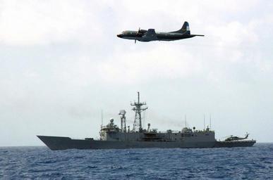Keywords: US Navy 040813-N-0507C-001 The guided missile frigate USS Crommelin (FFG 37) and an Argentinean P-3 aircraft patrol the northern approach to the Panama Canal.jpg en Gulf of Panama Aug 13 2004 The guided missile frigate USS Crommelin FFG 37 and an Argentinean P-3 aircraft patrol the northern approach to the Panama Canal in search of a suspect vessel in support of PANAMAX 2004 Naval forces from eight countries are participating in PANAMAX 2004 a naval exercise designed to build up a coalition response to security threats against the Panama Canal PANAMAX is conducted under the direction of Commander Naval Forces Southern Command and involves the identification monitoring and interdiction of vessels posing a simulated terrorist threat to the Canal The multinational force includes surface and air assets from Argentina Colombia Chile Dominican Republic Honduras Panama Peru and the United States operating in the north and south approaches to the Canal PANAMAX s realistic scenario develops not only interoperability among naval forces but also joint and inter-agency interoperability as the naval forces work together with other services and agencies of Panama to ensure the safety of the Canal and to protect freedom of navigation U S Navy photo by Lt Ligia Cohen RELEASED 2004-08-13 040813-N-0507C-001 Navy http //www navy mil/view_image asp id 17075 U S Navy photo by Lt Ligia Cohen PD-USGov-Military-Navy United States Navy in the Gulf of Panama PANAMAX 2004 P-3 Orion of the navy of Argentina USS Crommelin FFG-37 |