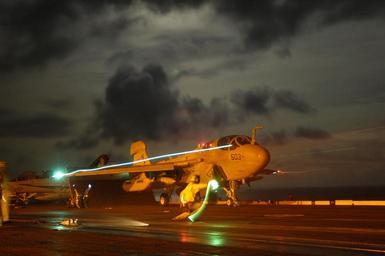 Keywords: US Navy 040831-N-5781F-068 A shooter gives the signal to launch an EA-6B Prowler assigned to Electronic Attack Squadron One Three Five (VAQ-135), aboard the conventionally powered aircraft carrier USS Kitty Hawk (CV 63) during.jpg en Pacific Ocean Aug 31 2004 - A shooter gives the signal to launch an EA-6B Prowler assigned to the Black Ravens of Electronic Attack Squadron One Three Five VAQ-135 aboard the conventionally powered aircraft carrier USS Kitty Hawk CV 63 during nighttime flight operations Flight operations are conducted around the clock to ensure optimum proficiency for pilots squadrons and ship's personnel Kitty Hawk is currently under way in the 7th Fleet area of responsibility AOR demonstrating power projection and sea control as the world's only permanently forward-deployed aircraft carrier operating from Yokosuka Japan U S Navy photo by Photographer's Mate Airman Bo J Flannigan RELEASED 2004-08-31 040831-N-5781F-068 Navy http //www navy mil/view_image asp id 17484 U S Navy photo by Photographer's Mate Airman Bo J Flannigan PD-USGov-Military-Navy Grumman EA-6 Prowler Aboard USS Kitty Hawk CV-63 Aircraft carrier take offs Military activities at night Marshalling wands Electronic Attack Squadron 135 United States Navy |