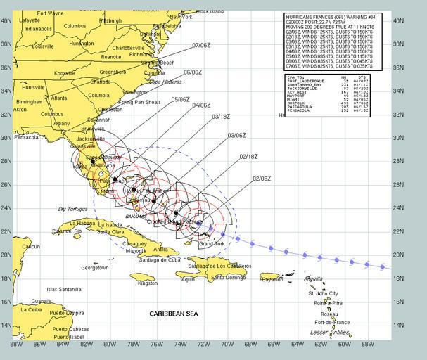 | Keywords: US Navy 040902-N-0000X-007 Current forecast projected path and wind speeds of Hurricane Frances from Sept 2 to Sept 7.jpg en Mid-Atlantic Ocean Sept 2 2004 Current forecast projected path and wind speeds of Hurricane Frances from Sept 2 to Sept 7 Frances a category four hurricane on the Saffir-Simpson hurricane scale is approximately 500 miles east-southeast of the Florida East Coast moving at near 14 knots Maximum sustained winds remain near 140 MPH with winds extending outwards up to 80 miles The core of the storm is expected to be near Florida within two days only three weeks after Hurricane Charley left billions of dollars in damage as it swept across the peninsula Photo provided by Naval Atlantic Meteorology and Oceanography Center RELEASED For more information visit <a href https //weather navy mil Target _BLANK >https //weather navy mil</a> 2004-09-02 040902-N-0000X-007 Navy http //www navy mil/view_image asp id 17362 U S Navy photo PD-USGov-Military-Navy Satellite pictures of Hurricane Frances |