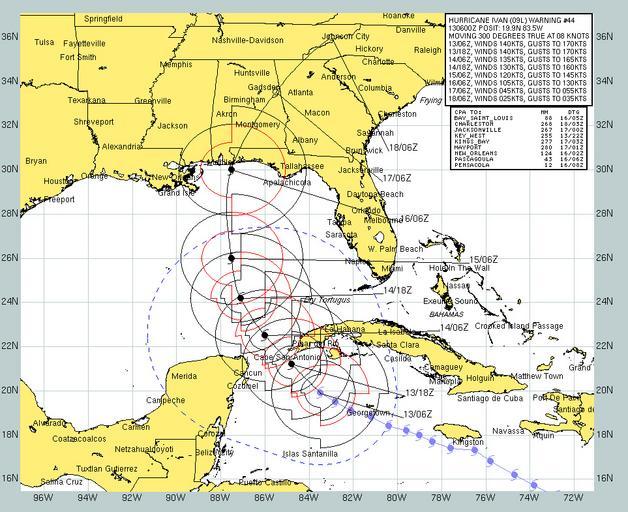 | Keywords: US Navy 040913-N-0000X-002 Current forecast projected path and wind speeds of Hurricane Ivan from Sept 13 to Sept 18.jpg en Caribbean Sea Sept 13 2004 Current forecast projected path and wind speeds of Hurricane Ivan from Sept 13 to Sept 18 Ivan an extremely dangerous category five hurricane on the Saffir-Simpson Hurricane scale has maximum sustained winds near 160 mph with higher gusts Hurricane force winds extend outward up to 105 miles from the center and tropical storm force winds extend outward up to 200 miles The well-defined eye of hurricane Ivan was located about 110 miles south-southeast of the Western tip of Cuba Hurricane Ivan has killed at least 65 people in the Caribbean as it barrels toward Cuba and possibly the Florida panhandle Mississippi or Louisiana Photo provided by Naval Atlantic Meteorology and Oceanography Center RELEASED For more information visit <a href https //weather navy mil Target _BLANK >https //weather navy mil</a> 2004-09-13 040913-N-0000X-002 Navy http //www navy mil/view_image asp id 17587 U S Navy photo PD-USGov-Military-Navy Hurricane Ivan |
