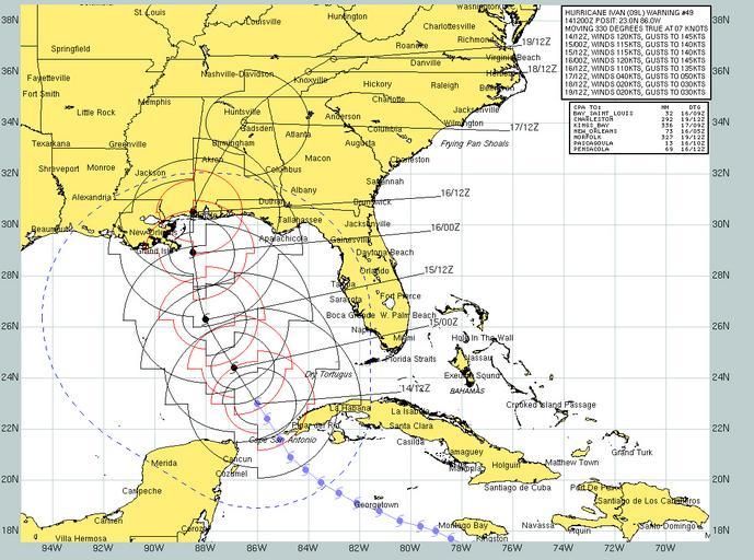 | Keywords: US Navy 040914-N-0000X-003 Current forecast projected path and wind speeds of Hurricane Ivan from Sept 14 to Sept 19.jpg en Caribbean Sea Sept 14 2004 Current forecast projected path and wind speeds of Hurricane Ivan from Sept 14 to Sept 19 Ivan an extremely dangerous category four hurricane on the Saffir-Simpson Hurricane scale has maximum sustained winds near 140 mph with higher gusts Hurricane force winds extend outward up to 100 miles from the center and tropical storm force winds extend outward up to 260 miles The well-defined eye of hurricane Ivan was located about 405 miles south-southeast of the mouth of the Mississippi River Hurricane Ivan has killed at least 65 people in the Caribbean and it now poses a threat to the Florida panhandle and the Gulf Coast States Photo provided by Naval Atlantic Meteorology and Oceanography Center RELEASED For more information visit <a href https //weather navy mil Target _BLANK >https //weather navy mil</a> 2004-09-14 040914-N-0000X-003 Navy http //www navy mil/view_image asp id 17643 U S Navy photo PD-USGov-Military-Navy Hurricane Ivan |