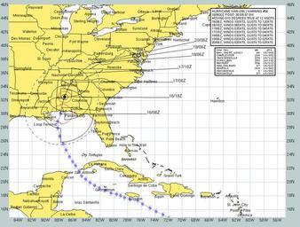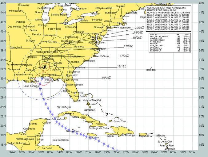 | Keywords: US Navy 040916-N-0000X-001 Current forecast projected path and wind speeds of Hurricane Ivan from Sept 16 to Sept 20.jpg en Gulf of Mexico Sept 16 2004 - Current forecast projected path and wind speeds of Hurricane Ivan from Sept 16 to Sept 20 Ivan a category one hurricane on the Saffir-Simpson Hurricane scale has maximum sustained winds near 80 mph with higher gusts Hurricane force winds extend outward up to 150 miles from the center and tropical storm force winds extend outward up to 290 miles The eye of hurricane Ivan was located about 90 miles west-southwest Montgomery Ala Ivan made landfall at Gulf Shores Ala at approximately 0315 EST Hurricane Ivan has killed at least 80 people since it's development in the Caribbean Sea Photo provided by Naval Atlantic Meteorology and Oceanography Center RELEASED For more information visit <a href https //weather navy mil Target _BLANK >https //weather navy mil</a> 2004-09-16 040916-N-0000X-001 Navy http //www navy mil/view_image asp id 17680 U S Navy photo PD-USGov-Military-Navy Maps of the Gulf of Mexico |