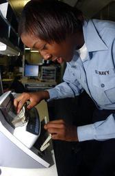 Keywords: US Navy 041007-N-8158F-018 Disbursing Clerk 3rd Class Lakisha Williams of Memphis, Tenn., completes cash verification using the Magner 75 cash counting machine aboard the aircraft carrier USS Nimitz (CVN 68).jpg en Pacific Ocean Oct 7 2004 - Disbursing Clerk 3rd Class Lakisha Williams of Memphis Tenn completes cash verification using the Magner 75 cash counting machine aboard the aircraft carrier USS Nimitz CVN 68 The Magner 75 provides accurate high speed processing at 1 500 notes per minutes advanced currency authentication and detection capabilities Nimitz is currently conducting Nuclear Power Mobile Training Team II NPMTT II exercises off the coast of southern California U S Navy photo by Photographer s Mate Airman Roland Franklin RELEASED 2004-10-07 041007-N-8158F-018 Navy http //www navy mil/view_image asp id 18119 U S Navy photo by Photographer s Mate Airman Roland Franklin PD-USGov-Military-Navy Authentication Aboard USS Nimitz CVN-68 Disbursing Clerk |