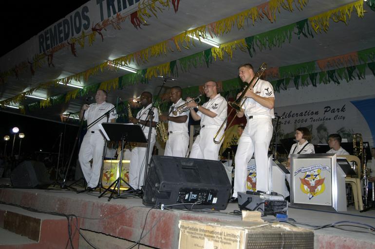 | Keywords: US Navy 041020-N-0421S-254 From left, Musician 2nd Classes Tom Horner, Frank Newton, Lloyd Whitty, Chris Beehler, and Joseph Dowdy perform with members of the Commander Seventh Fleet Band.jpg en Tacloban City Leyte Philippines Oct 20 2004 - From left Musician 2nd Classes Tom Horner Frank Newton Lloyd Whitty Chris Beehler and Joseph Dowdy perform with members of the Commander Seventh Fleet Band The Band played music from the big-band era during their performance at Remedios Trinidad Romualdez Plaza in Tacloban City The Commander Seventh Fleet Band's visit coincided with the 60th Anniversary of the World War II Leyte Gulf Landings Commander Seventh Fleet Band is assigned to the Seventeen Fleet command ship USS Blue Ridge LCC 19 homeported Yokosuka Japan U S Navy photo by Chief Photographer's Mate John S Stadelman RELEASED 2004-10-20 041020-N-0421S-254 Navy http //www navy mil/view_image asp id 18343 U S Navy photo by Chief Photographer's Mate John S Stadelman PD-USGov-Military-Navy Images from US Navy location Tacloban Philippines |