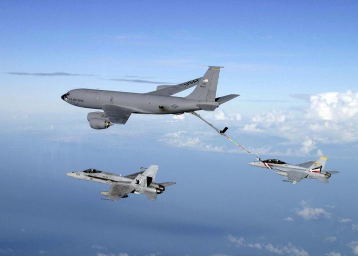 | Keywords: US Navy 041101-N-3799S-001 An F-A-18F Super Hornet and an F-A-18C Hornet conducts in-flight refueling from a U.S. Air Force KC-135 Stratotanker assigned to the Alaska Air National Guard.jpg en Pacific Ocean Nov 1 2004 - An F/A-18F Super Hornet assigned to the Bounty Hunters of Strike Fighter Squadron Two VFA-2 lower right and an F/A-18C Hornet assigned to the Marauders of Strike Fighter Squadron Eight Two VFA-82 conducts in-flight refueling from a U S Air Force KC-135 Stratotanker assigned to the Alaska Air National Guard Both fighter aircraft are assigned to Carrier Air Wing Two CVW-2 currently embarked aboard the Nimitz-class aircraft carrier USS Abraham Lincoln CVN 72 U S Navy photo by Lt Perry Solomon RELEASED 2004-11-01 041101-N-3799S-001 Navy http //www navy mil/view_image asp id 18630 U S Navy photo by Lt Perry Solomon PD-USGov-Military-Navy Aerial refueling of F/A-18C Hornet Strike Fighter Squadron 82 United States Navy F/A-18F Super Hornet in flight Strike Fighter Squadron 2 United States Navy Boeing KC-135 Stratotanker 168th Air Refueling Wing Alaska Air National Guard |