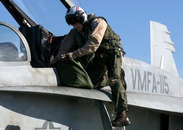 Keywords: US Navy 041125-N-5345W-026 U.S. Marine Corps Maj. Rhett Lawing performs a pre-flight check before climbing into the cockpit.jpg en Persian Gulf Nov 25 2004 U S Marine Corps Maj Rhett Lawing assigned to the Silver Eagles of Marine Fighter Attack Squadron One One Five VMFA-115 performs a pre-flight check before climbing into the cockpit of his F/A-18A Hornet to participate in combat sorties from the Nimitz-class aircraft carrier USS Harry S Truman CVN 75 Truman's Carrier Strike Group Ten CSG-10 and her embarked Carrier Air Wing Three CVW-3 are currently on a scheduled deployment in support of the Global War on Terrorism U S Navy photo by Photographer s Mate Airman Kristopher Wilson RELEASED 2004-11-25 041125-N-5345W-026 Navy http //www navy mil/view_image asp id 19255 U S Navy photo by Photographer s Mate Airman Kristopher Wilson PD-USGov-Military-Navy Aboard USS Harry S Truman CVN-75 Pre-flight checks USMC |