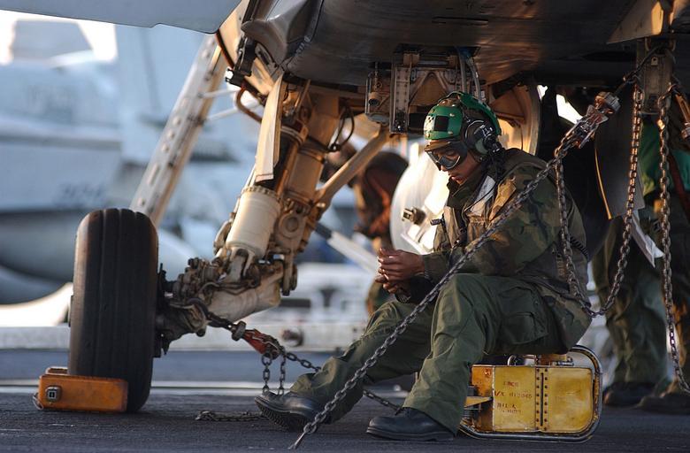 Keywords: US Navy 050116-N-4308O-053 A Marine, assigned to the Silver Eagles of Marine Fighter Attack Squadron One One Five (VMFA-115), performs routine maintenance to an F-A-18A- Hornet.jpg en Persian Gulf Jan 16 2005 - A Marine assigned to the Silver Eagles of Marine Fighter Attack Squadron One One Five VMFA-115 performs routine maintenance to an F/A-18A+ Hornet on the flight deck aboard the Nimitz-class aircraft carrier USS Harry S Truman CVN 75 Carrier Air Wing Three CVW-3 is embarked aboard Truman and is providing close air support and conducting intelligence surveillance and reconnaissance ISR missions over Iraq The Truman Strike Group is on a regularly scheduled deployment in support of the Global War on Terrorism U S Navy photo by Photographer s Mate Airman Ryan O'Connor RELEASED 2005-01-16 050116-N-4308O-053 Navy http //www navy mil/view_image asp id 20826 U S Navy photo by Photographer s Mate Airman Ryan O'Connor PD-USGov-Military-Navy Aboard USS Harry S Truman CVN-75 F/A-18A Hornet on flight decks Retractable undercarriages Wheel chocks |