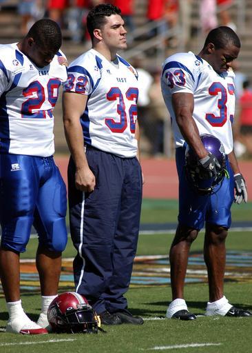 Keywords: US Navy 050122-N-3019M-002 Navy Midshipman Kyle Eckel stands at attention during the playing of the National anthem at the 2005 Hula Bowl All-Star game in Kahului, Maui, Hawaii.jpg en Kahului Maui Hawaii Jan 22 2005 - Navy Midshipman Kyle Eckel stands at attention during the playing of the National anthem at the 2005 Hula Bowl All-Star game in Kahului Maui Hawaii Eckel is the 24th player in school history to be selected for the Hula Bowl All-Star game but did not play because of an ankle injury sustained during practice Eckel who has also been selected to play in the East-West Shrine game and the Gridiron Classic is one of just six players in school history to be selected to three or more all-star games U S Navy photo by Journalist 3rd Class Ryan C McGinley RELEASED 2005-01-22 050122-N-3019M-002 Navy http //www navy mil/view_image asp id 21369 U S Navy photo by Journalist 3rd Class Ryan C McGinley PD-USGov-Military-Navy Images from US Navy location Kahului Hawaii |