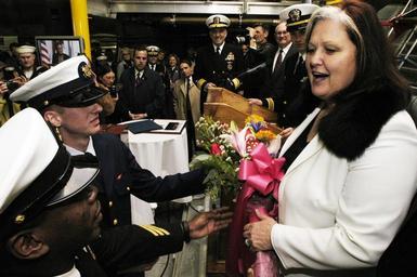 | Keywords: US Navy 050205-N-6477M-315 Ship Sponsor Mrs. Lynn Hunter receives flowers from Chief Boatswain^rsquo,s Mate Donald E. Murray, foreground, and Coast Guard Operation Specialist Seaman Jonathan L. Moore.jpg en Whidbey Island Wash Feb 5 2005 Ship Sponsor Mrs Lynn Hunter receives flowers from Chief Boatswain s Mate Donald E Murray foreground and Coast Guard Operation Specialist Seaman Jonathan L Moore at the reception for the christening ceremony of the experimental Littoral Surface Craft-Experimental X-Craft Sea Fighter FSF 1 at Nichols Brothers Boat Builders in Freeland Wash Sea Fighter will be used to evaluate the hydrodynamic performance structural behavior mission flexibility and propulsion system of high-speed vessels The X-Craft is a high-speed aluminum catamaran that will test a variety of technologies which will allow the Navy to operate more effectively in littoral or near-shore waters U S Navy photo by Photographer s Mate 2nd Class Eli J Medellin RELEASED 2005-02-05 050205-N-6477M-315 Navy http //www navy mil/view_image asp id 21588 U S Navy photo by Photographer s Mate 2nd Class Eli J Medellin PD-USGov-Military-Navy Naval Air Station Whidbey Island Ship christenings in the United States Navy Sea Fighter ship 2005 |