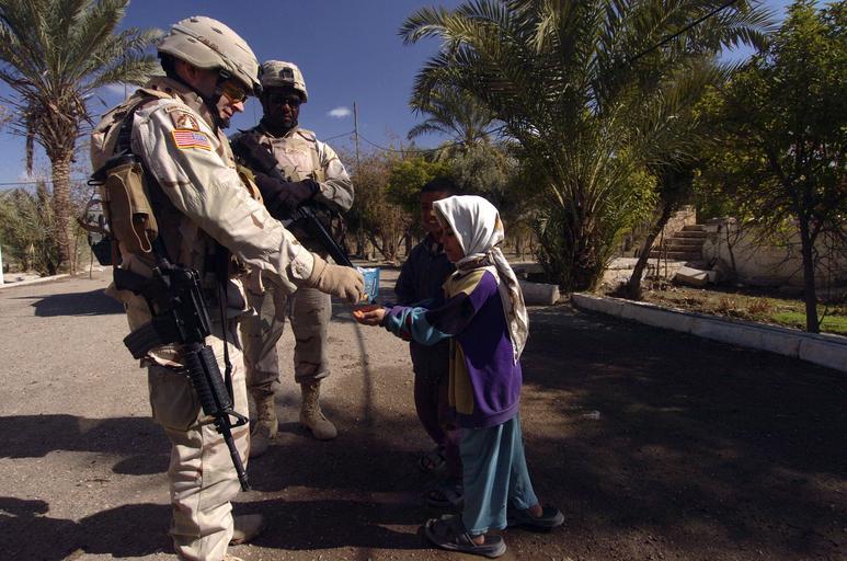 Keywords: US Navy 050205-N-5319A-006 A U.S. Army Solider, assigned to the 256th Brigade Combat Team (BCT), 2nd Battalion, hands-out trail mix to local children while delivering fertilizer to local farmers near Baghdad, Iraq.jpg en Baghdad Iraq Feb 5 2004 - A U S Army Solider assigned to the 256th Brigade Combat Team BCT 2nd Battalion hands-out trail mix to local children while delivering fertilizer to local farmers near Baghdad Iraq Louisiana Army National Guard 256th BCT's mission Amber Waves delivered more than 262 000 metric tons of fertilizer and agricultural supplies to local farmers throughout the Baghdad area U S Navy photo by Photographer's Mate 1st Class Brien Aho RELEASED 2004-02-05 050205-N-5319A-006 Navy http //www navy mil/view_image asp id 21676 U S Navy photo by Photographer's Mate 1st Class Brien Aho PD-USGov-Military-Navy Baghdad in the Iraq War |