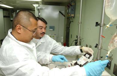 Keywords: US Navy 050217-N-6665R-022 Corpsmen deglycing frozen packs of red blood cells.jpg en Indian Ocean Feb 17 2005 Hospital Corpsman 2nd Class Renulfo Moralesa a lab technician aboard the Military Sealift Command MSC hospital ship USNS Mercy T-AH 19 cross-trains Hospital Corpsman 1st Class Christopher Mapanao on deglycing frozen packs of red blood cells for use aboard the ship Once the blood cell is deglyced it must be used in 24 hours Mercy is serving as an enabling platform to assist humanitarian operations ashore in ways that host nations and international relief organization find useful Mercy is currently off the waters of Indonesia in support of Operation Unified Assistance the humanitarian relief effort to aid the victims of the tsunami that struck Southeast Asia U S Navy photo by Photographer's Mate 2nd Class Jeffery Russell RELEASED 2005-02-17 050217-N-6665R-022 Navy http //www navy mil/view_image asp id 22021 U S Navy photo by Photographer's Mate 2nd Class Jeffery Russell PD-USGov-Military-Navy Aboard USNS Mercy T-AH-19 Hospital Corpsman |