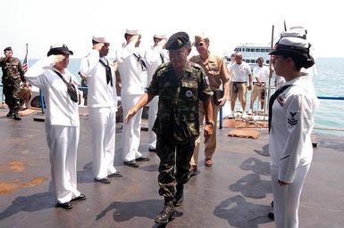 | Keywords: US Navy 050226-N-9860Y-001 Royal Thai Army Chief of Staff, Gen. Lertrat Rattavanich, walks through ceremonial sideboys for a scheduled tour of the command ship USS Blue Ridge (LCC 19).jpg en Phuket Thailand Feb 26 2005 Royal Thai Army Chief of Staff Gen Lertrat Rattavanich walks through ceremonial sideboys for a scheduled tour of the command ship USS Blue Ridge LCC 19 Blue Ridge is in Phuket to support Operation Unified Assistance the humanitarian relief effort to aid the victims of the tsunami that struck Southeast Asia The Sailors and Marines aboard Blue Ridge will participate in tsunami related community relations projects and conduct training with foreign military personnel U S Navy photo by Photographer's Mate 3rd Class Tucker M Yates RELEASED 2005-02-26 050226-N-9860Y-001 Navy http //www navy mil/view_image asp id 22383 U S Navy photo by Photographer's Mate 3rd Class Tucker M Yates PD-USGov-Military-Navy Images from US Navy location Phuket Thailand |