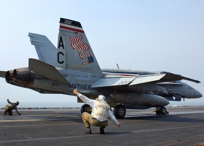 Keywords: US Navy 050227-N-0535P-033 Two Marine final checkers give the thumbs up for an F-A-18A- Hornet to launch.jpg en Persian Gulf Feb 27 2005 - Two Marine final checkers assigned to the Silver Eagles of Marine Fighter Attack Squadron One One Five VMFA-115 give the thumbs up for an F/A-18A+ Hornet to launch from the flight deck aboard USS Harry S Truman CVN 75 Carrier Air Wing Three CVW-3 is embarked aboard Truman and is providing close air support and conducting intelligence surveillance and reconnaissance over Iraq The Truman Carrier Strike Group is on a regularly scheduled deployment in support of the Global War on Terrorism U S Navy photo by Photographer's Mate Airman Jay C Pugh RELEASED 2005-02-27 050227-N-0535P-033 Navy http //www navy mil/view_image asp id 22450 U S Navy photo by Photographer's Mate Airman Jay C Pugh PD-USGov-Military-Navy Aboard USS Harry S Truman CVN-75 Military people with thumbs up |
