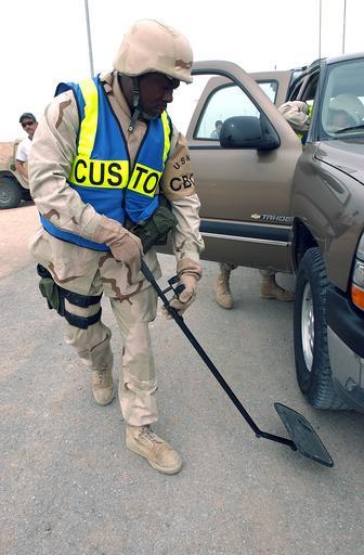 | Keywords: US Navy 050308-N-6027E-001 Aviation Machinist^rsquo,s Mate 2nd Class Terrance Byrom of Atlanta, Ga., conducts a security check on the underside of a vehicle near the border between Kuwait and Iraq.jpg en Camp Navistar Kuwait Mar 8 2005 Aviation Machinist s Mate 2nd Class Terrance Byrom of Atlanta Ga conducts a security check on the underside of a vehicle near the border between Kuwait and Iraq Petty Officer Byrom is a Navy reservist assigned to Naval Expeditionary Logistics Support Force NAVELSF Forward Oscar Charlie Company on board Camp Navistar in Northern Kuwait Forward Oscar recently relieved the U S Air Force's 887th Expeditionary Security Forces Squadron NAVELSF is performing the customs mission for the U S Army throughout Kuwait and Iraq U S Navy photo by Chief Journalist Kevin Elliott RELEASED 2005-03-08 050308-N-6027E-001 Navy http //www navy mil/view_image asp id 22509 U S Navy photo by Chief Journalist Kevin Elliott PD-USGov-Military-Navy Camp Navistar Vehicle inspection mirrors |