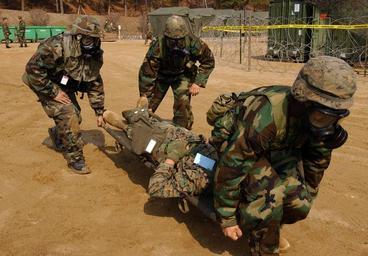 Keywords: US Navy 050322-N-7027P-119 U.S. Marines assigned to the 3rd Marine Expeditionary Force, perform a casualty decontamination drill at Third Republic of Korea Army Base during Reception, Staging, Onward movement, and Integration-F.jpg en Yogin Republic of Korea Mar 22 2005 U S Marines assigned to the 3rd Marine Expeditionary Force perform a casualty decontamination drill at Third Republic of Korea Army Base during Reception Staging Onward movement and Integration/Foal Eagle exercises RSO I/Foal Eagle RSO I is a complex multi-phase exercise conducted annually tailored to train test and demonstrate United States and Republic of Korea force projection and deployment capabilities Foal Eagle exercise runs simultaneously and trains in all aspects of Combined Forces Command's mission U S Navy photo by Photographer's Mate 2nd Class Sandra M Palumbo RELEASED 2005-03-22 050322-N-7027P-119 Navy http //www navy mil/view_image asp id 22939 U S Navy photo by Photographer's Mate 2nd Class Sandra M Palumbo PD-USGov-Military-Navy Images from US Navy location Yogin Republic of Korea Foal Eagle 2005 M40 Field Protective Mask Casualty movement III Marine Expeditionary Force |