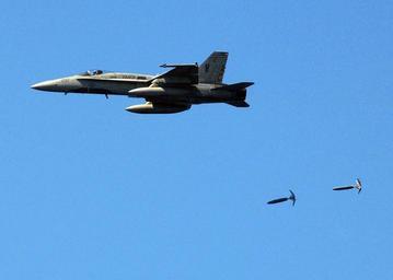 Keywords: US Navy 050329-N-5345W-137 An F-A-18A- Hornet drops two inert 500 pound Mk-82 general purpose bombs.jpg en Mediterranean Sea Mar 29 2005 - An F/A-18A+ Hornet assigned to the Silver Eagles of Marine Fighter Attack Squadron One One Five VMFA-115 drops two inert 500 pound Mk-82 general purpose bombs onto a target area off of the port side of the Nimitz-class aircraft carrier USS Harry S Truman CVN 75 during an air power demonstration performed by the squadrons of Carrier Air Wing Three CVW-3 The Harry S Truman Carrier Strike Group was recently relieved after completing nearly four months in the Persian Gulf in support of the Global War on Terrorism U S Navy photo by Photographer's Mate Airman Kristopher Wilson RELEASED 2005-03-29 050329-N-5345W-137 Navy http //www navy mil/view_image asp id 23226 U S Navy photo by Photographer's Mate Airman Kristopher Wilson PD-USGov-Military-Navy F/A-18A Hornet in flight Mark 82 bomb Practice bombs Aerial bombing Marine Fighter Attack Squadron 115 |