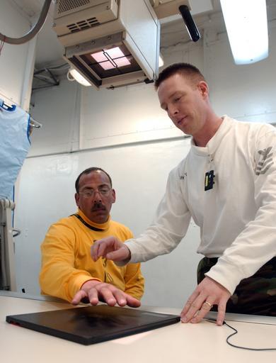 | Keywords: US Navy 050404-N-6410T-001 Hospital Corpsman 1st Class Troy Murphy, right, prepares a patient^rsquo,s hand for an X-ray.jpg en Atlantic Ocean Apr 4 2005 - Hospital Corpsman 1st Class Troy Murphy right prepares a patient s hand for an X-ray aboard the Nimitz-class aircraft carrier USS Theodore Roosevelt CVN 71 Roosevelt is currently underway for Tailored Ship Training Availability and Final Evaluation Problem TSTA/FEP in the Atlantic Ocean U S Navy photo by Photographer's Mate Airman Chris Thamann RELEASED 2005-04-04 050404-N-6410T-001 Navy http //www navy mil/view_image asp id 23347 U S Navy photo by Photographer's Mate Airman Chris Thamann PD-USGov-Military-Navy Hospital Corpsman Aboard USS Theodore Roosevelt CVN-71 |