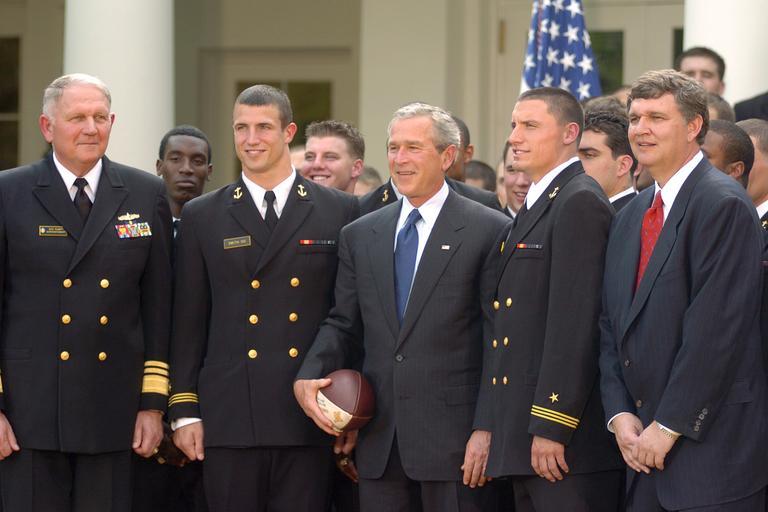 Keywords: US Navy 050420-N-0000A-003 President George W. Bush, center, poses for a photograph with members of the U.S. Naval Academy football team fter the presentation of the Commander-In-Chief's Trophy in Rose Garden at the White Hous.jpg en Washington D C April 20 2005 - President George W Bush center poses for a photograph with members of the U S Naval Academy football team fter the presentation of the Commander-In-Chief's Trophy in Rose Garden at the White House President Bush hailed Navy's football team Wednesday for winning the Commander-In-Chief's trophy for the second year in a row The trophy goes each year to the team with the best record in games between the three service academies Navy finished the year with a school-record tying 10 victories marking the first time in 99 years that Navy has won 10 football games in a single season Navy beat Air Force 24-21 and Army 34-6 Photo by Carolyn Andros courtesy U S Naval Academy Athletic Associaion RELEASED 2005-04-20 050420-N-0000A-003 Navy http //www navy mil/view_image asp id 23740 U S Navy photo PD-USGov-Military-Navy People of the United States Navy George W Bush in 2005 |