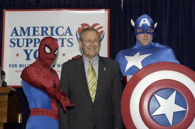 | Keywords: US Navy 050428-N-0295M-002 Secretary of Defense Donald Rumsfeld poses with superheroes Spider-Man and Captain America during the unveiling of a comic book that will be distributed free to U.S. forces in Iraq and around the worl.jpg en Pentagon Washington D C April 28 2005 - Secretary of Defense Donald Rumsfeld poses with superheroes Spider-Man and Captain America during the unveiling of a comic book that will be distributed free to U S forces in Iraq and around the world Featuring the Avengers Fantastic Four Spider-Man and other Marvel heroes the comic will have a print run of one million copies and be distributed through the military exchanges The first 150 000 copies will be distributed to personnel in the Middle East The comic book is part of America Supports You a Department of Defense campaign that encourages private citizens communities and businesses to reach out to military personnel and their families U S Navy photo by Photographer's Mate 2nd Class Daniel J McLain RELEASED 2005-04-28 050428-N-0295M-002 Navy http //www navy mil/view_image asp id 24006 U S Navy photo by Photographer's Mate 2nd Class Daniel J McLain PD-USGov-Military-Navy Cosplay of Spider-Man and his cast Cosplay of Captain America and his cast Donald Rumsfeld in 2005 America Supports You |