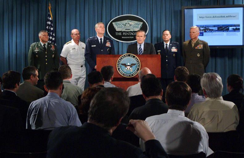 Keywords: US Navy 050512-N-2383B-007 The Military's top leaders address the media during a press conference held at the Pentagon.jpg en Washington D C May 12 2005 - The Military's top leaders address the media concerning the decision making process for the current Base Realignment and Closures BRAC during a press conference held at the Pentagon From left are Vice Chief of Staff U S Army Gen Richard A Cody Chief of Naval Operations CNO Adm Vern Clark U S Air Force Chairman of the Joint Chief's of Staff Gen Richard B Meyers Secretary of Defense the Honorable Donald Rumsfeld Chief of Staff U S Air Force Gen John P Jumper and Commandant of the Marine Corps Gen Michael Hagee U S Navy photo by Chief Photographer's Mate Johnny Bivera RELEASED 2005-05-12 050512-N-2383B-007 Navy http //www navy mil/view_image asp id 24283 U S Navy photo by Chief Photographer's Mate Johnny Bivera PD-USGov-Military-Navy Joint Chiefs of Staff Vern Clark Donald Rumsfeld in 2005 Michael W Hagee Richard A Cody Pentagon press briefing room |