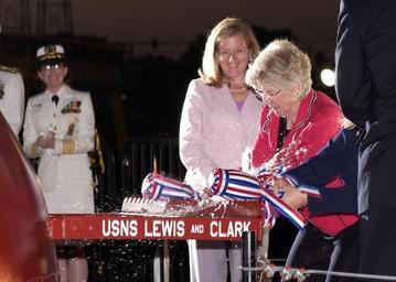 Keywords: US Navy 050521-N-1577S-124 Ship sponsors, Mrs. Jane Lewis Sale Henley and Ms. Lisa Clark, christen the Military Sealift Command (MSC) auxiliary dry cargo carrier USNS Lewis and Clark, (T-AKE 1).jpg en San Diego Calif May 21 2005 - Ship sponsors Mrs Jane Lewis Sale Henley and Ms Lisa Clark christen the Military Sealift Command MSC auxiliary dry cargo carrier USNS Lewis and Clark T-AKE 1 during a ceremony held at the National Steel and Shipbuilding Company NASSCO in San Diego Calif Lewis and Clark is the first of the newest class of underway replenishment ships built for naval service and is named in honor of the legendary explorers Direct descendents of Capt Meriwether Lewis and Capt William Clark Mrs Jane Lewis Sale Henley and Ms Lisa Clark were on hand to help celebrate the launching of their ancestor's namesake U S Navy photo by Photographer's Mate 3rd Class Timothy F Sosa RELEASED 2005-05-21 050521-N-1577S-124 Navy http //www navy mil/view_image asp id 24559 U S Navy photo by Photographer's Mate 3rd Class Timothy F Sosa PD-USGov-Military-Navy NASSCO ship launch ceremonies |