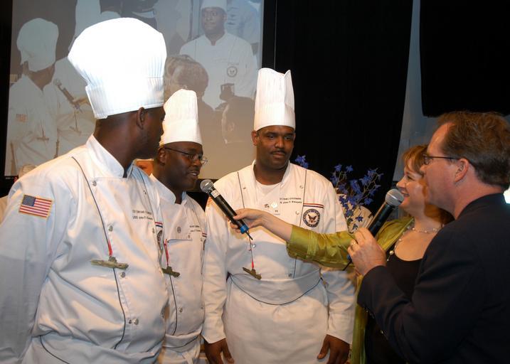 | Keywords: US Navy 050529-N-7695R-142 Culinary Specialists 1st Class Alton Coleman, Christopher Jennings and James Flowers assigned to the USS John F. Kennedy (CV 67) share food secrets with the hosts of the 2005 Fleet Week Best Chow comp.jpg en New York N Y May 29 2005 - Culinary Specialists 1st Class Alton Coleman Christopher Jennings and James Flowers assigned to the USS John F Kennedy CV 67 share food secrets with the hosts of the 2005 Fleet Week Best Chow competition held aboard the display ship USS Intrepid The Best Chow judging was conducted by various civilian and military chefs from around the world U S Navy photo by Photographer's Mate Airman Anthony Riddle RELEASED 2005-05-29 050529-N-7695R-142 Navy http //www navy mil/view_image asp id 24857 U S Navy photo by Photographer's Mate Airman Anthony Riddle PD-USGov-Military-Navy Fleet Week New York 2005 Culinary specialist United States Navy Aboard USS John F Kennedy CV-67 Chef's hat |