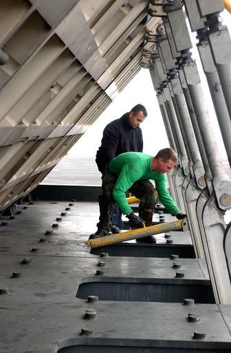 | Keywords: US Navy 050531-N-0902H-062 Aviation Boatswain's Mate Airman Cody Dlouhy, foreground, braces a jet blast deflector as Aviation Boatswain's Mate Airman David Harrell acts as his safety observer.jpg en Pacific Ocean May 31 2005 - Aviation Boatswain's Mate Airman foreground braces a jet blast David Harrell acts as his safety observer on the flight deck aboard the Nimitz-class aircraft carrier USS Ronald Reagan CVN 76 Reagan is currently underway in the conducting Combat System Ship s Qualifications Trials CSSQT U S Navy photo by Photographer's Mate Airman Zachariah A C Hinds RELEASED 2005-05-31 050531-N-0902H-062 Navy http //www navy mil/view_image asp id 24941 U S Navy photo by Photographer's Mate Airman Zachariah A C Hinds PD-USGov-Military-Navy Aviation Boatswain's Mates Equipment Blast deflectors on USS Ronald Reagan CVN-76 |