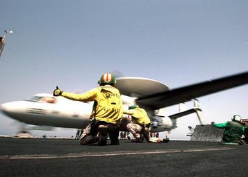Keywords: US Navy 050603-N-3241H-005 Two flight deck shooters give the clear to launch signal as an E-2C Hawkeye assigned the.jpg en Persian Gulf June 3 2005 - Two flight deck shooters give the clear to launch signal as an E-2C Hawkeye assigned the Golden Hawks of Airborne Early Warning Squadron One Two Two VAW-112 launch from the flight deck aboard the Nimitz-class aircraft carrier USS Carl Vinson CVN 70 The Carl Vinson Carrier Strike Group is currently deployed in support of multi-national forces in Iraq and maritime security operations in order to set the conditions for security and stability in the region Vinson will end its deployment with a homeport shift to Norfolk Va and commence a three-year refuel and complex overhaul U S Navy photo by Photographer's Mate 3rd Class Dusty Howell RELEASED 2005-06-03 050603-N-3241H-005 Navy http //www navy mil/view_image asp id 25049 U S Navy photo by Photographer's Mate 3rd Class Dusty Howell PD-USGov-Military-Navy Aboard USS Carl Vinson CVN-70 Northrop Grumman E-2C Hawkeye aircraft carrier take-offs Airborne Early Warning Squadron 112 United States Navy |