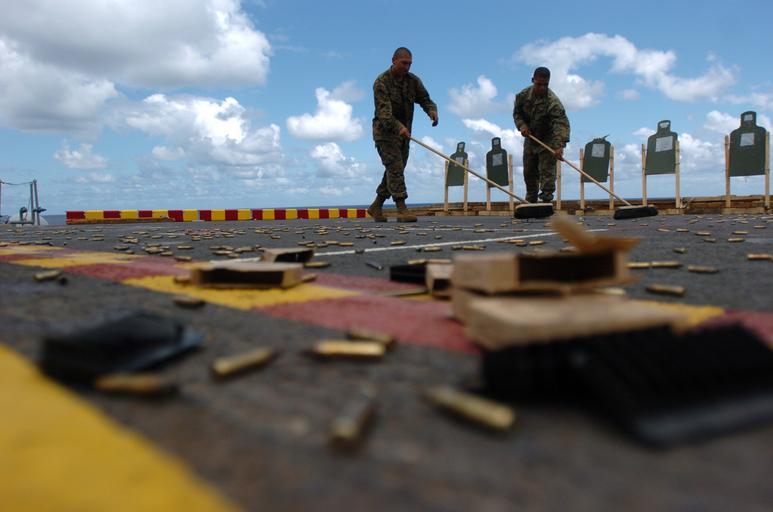 | Keywords: US Navy 050623-N-9866B-037 Two Marines, assigned to the 3rd Amphibious Assault Battalion based at Camp Pendleton, Calif., sweep up spent shell casings.jpg en Pacific Ocean June 23 2005 - Two Marines assigned to the 3rd Amphibious Assault Battalion based at Camp Pendleton Calif sweep up spent shell casings after an M-16 live fire weapons exercise aboard the amphibious assault ship USS Peleliu LHA 5 U S Navy photo by Journalist 2nd Class Zack Baddorf RELEASED 2005-06-23 050623-N-9866B-037 Navy http //www navy mil/view_image asp id 25629 U S Navy photo by Journalist 2nd Class Zack Baddorf PD-USGov-Military-Navy Aboard USS Peleliu LHA-5 Cartridge cases 3rd_Assault_Amphibian_Battalion |