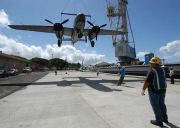 Keywords: US Navy 050628-N-3019M-001 A line handler directs as a World War II-vintage B-25 Mitchell medium bomber is lowered by crane to the pier after being transported via barge from Hickam Air Force Base to Ford Island.jpg en Pearl Harbor Hawaii June 28 2005 - A line handler directs as a World War II-vintage B-25 Mitchell medium bomber is lowered by crane to the pier after being transported via barge from Hickam Air Force Base to Ford Island Pearl Harbor The B-25 which represents one of the most successful medium bombers of World War II will undergo restoration work in preparation for the opening of the Pacific Aviation Museum U S Navy photo by Journalist 3rd Class Ryan C McGinley RELEASED 2005-06-28 050628-N-3019M-001 Navy http //www navy mil/view_image asp id 25752 U S Navy photo by Journalist 3rd Class Ryan C McGinley PD-USGov-Military-Navy Aircraft at Pacific Aviation Museum B-25 Mitchell museum aircraft |