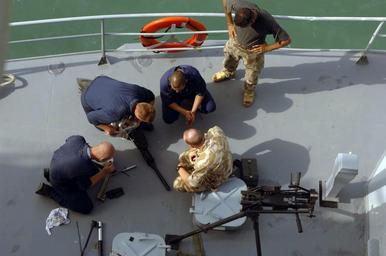 Keywords: US Navy 050704-N-4309A-057 Sailors assigned to the amphibious dock landing ship USS Ashland (LSD 48) and the Royal Navy help clean a Polish-made 50-cal DSKA aboard an Iraqi patrol boat while it refuels with the Ashland.jpg en Persian Gulf July 4 2005 Sailors assigned to the amphibious dock landing ship USS Ashland LSD 48 and the Royal Navy help clean a Polish-made 50-cal DSKA aboard an Iraqi patrol boat while it refuels with the Ashland Ashland is combining efforts with coalition forces under the flag of Commander Task Force Five Eight CTF-58 in support of maritime security operations MSO by conducting security support for the Iraqi oil platforms U S Navy Photo by Photographer's Mate 1st Class Aaron Ansarov RELEASED 2005-07-04 050704-N-4309A-057 Navy http //www navy mil/view_image asp id 26035 U S Navy Photo by Photographer's Mate 1st Class Aaron Ansarov PD-USGov-Military-Navy Aboard USS Ashland LSD-48 |