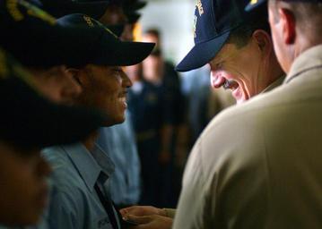 | Keywords: US Navy 050712-N-0962S-074 Master Chief Petty Officer of the Navy (MCPON) Terry Scott pins an Enlisted Aviation Warfare Specialist (EAWS) pin on a Sailor.jpg en Persian Gulf July 12 2005 - Master Chief Petty Officer of the Navy MCPON Terry Scott pins an Enlisted Aviation Warfare Specialist EAWS pin on a Sailor aboard amphibious assault ship USS Kearsarge LHD 3 prior to an all hands call During the visit MCPON visited with Sailors about their changing and evolving missions in the Global War on Terrorism U S Navy photo by Journalist 1st Class Brandan W Schulze RELEASED 2005-07-12 050712-N-0962S-074 Navy http //www navy mil/view_image asp id 26362 U S Navy photo by Journalist 1st Class Brandan W Schulze PD-USGov-Military-Navy Aboard USS Kearsarge LHD-3 Terry D Scott |