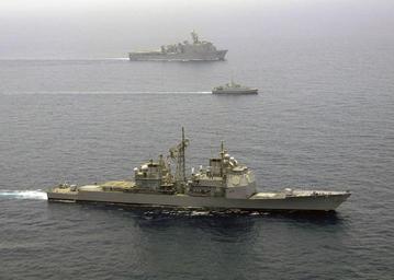 Keywords: US Navy 050719-N-5526M-014 The guided missile cruiser USS Philippine Sea (CG 58), amphibious dock landing ship USS Gunston Hall (LSD 44), and Al Jawf class His Majesty's Ship (HMS) Shaqra (MHC 422) conduct Surface Action Group.jpg en Persian Gulf July 19 2005 - The guided missile cruiser USS Philippine Sea CG 58 amphibious dock landing ship USS Gunston Hall LSD 44 and Al Jawf class His Majesty's Ship HMS Shaqra MHC 422 conduct Surface Action Group operations during exercise Nautical Union Nautical Union is a joint exercise directed through Commander Destroyer Squadron Five Zero COMDESRON 50 between the U S and coalition forces Nautical Union operations include conducting Maritime Security Operations MSO training air defense anti submarine warfare surface warfare mine counter measures electronic warfare replenishment at sea RAS and command and control Maritime Security Operations MSO set the conditions for security and stability in the maritime environment as well as complements the counter-terrorism and security efforts of regional nations U S Navy photo by Photographer's Mate 1st class Robert R McRill RELEASED 050719-N-5526M-014 Navy http //www navy mil/view_image asp id 26596 U S Navy photo by Photographer's Mate 1st class Robert R McRill PD-USGov-Military-Navy USS Philippine Sea CG-58 General views of USS Gunston Hall LSD-44 Underway replenishment Navy of Saudi Arabia Photographs by Robert R McRill |
