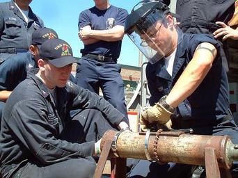 | Keywords: US Navy 050727-N-8825R-011 Hull Technician Fireman Brandon Jackson, right, and Damage Controlman 3rd Class Seth Lindauer demonstrate pipe-patching techniques.jpg en Everett Wash July 27 2005 - Hull Technician Fireman Brandon Jackson right and Damage Controlman 3rd Class Seth Lindauer demonstrate pipe-patching techniques and other vital damage control scenarios in preparation of the Command Assessment and Readiness Training CART evaluation phase two aboard the guided-missile frigate USS Ford FFG 54 The crew of the Perry-class frigate is undergoing a rigorous training cycle in preparation for its upcoming deployment to South America U S Navy photo by Photographer's Mate 3rd Class Aramis Ramirez RELEASED 2005-07-27 050727-N-8825R-011 Navy http //www navy mil/view_image asp id 26976 U S Navy photo by Photographer's Mate 3rd Class Aramis Ramirez PD-USGov-Military-Navy Naval Station Everett USS Ford FFG-54 |