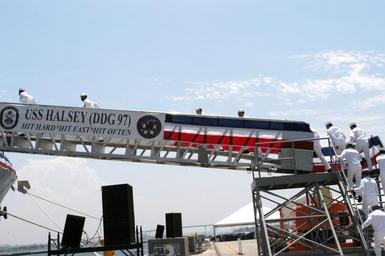 | Keywords: US Navy 050730-N-3672K-294 Sailors assigned to the Navy's newest Arleigh Burke-class destroyer, USS Halsey (DDG 96) ^ldquo,man the ship^rdquo, as they bring the ship to life during the ship's commissioning ceremony.jpg en San Diego Calif July 30 2005 - Sailors assigned to the Navy's newest Arleigh Burke-class destroyer USS Halsey DDG 97 man the ship as they bring the ship to life during the ship's commissioning ceremony The ceremony marked the formal entrance of the guided missile destroyer into the fleet The ship was named after U S Naval Academy graduate Fleet Adm William Bull Halsey Jr who commanded South Pacific Force and South Pacific Area during World War II Halsey is capable of fighting air surface and subsurface battles simultaneously and the ship contains a number of offensive and defensive weapons designed to support maritime defense needs well into the 21st century U S Navy photo by Lithographer's Mate 1st Class John P Kass RELEASED 2005-07-30 050730-N-3672K-294 Navy http //www navy mil/view_image asp id 26747 U S Navy photo by Lithographer's Mate 1st Class John P Kass PD-USGov-Military-Navy Commissioning of USS Halsey DDG-97 |