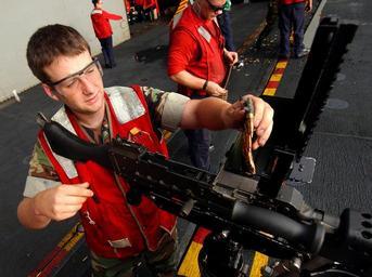 Keywords: US Navy 050730-N-5345W-059 Interior Communications Electrician 3rd Class Gregory Danz feeds a belt of shells from an ammo box into his M-240 machine gun.jpg en Atlantic Ocean July 30 2005 - Interior Communications Electrician 3rd Class Gregory Danz feeds a belt of shells from an ammo box into his M-240 machine gun prior to participating in a small arms qualification aboard the Nimitz-class aircraft carrier USS Harry S Truman CVN 75 Truman is currently conducting carrier qualifications and sustainment operations off of the East Coast U S Navy photo by Photographer's Mate 3rd Class Kristopher Wilson RELEASED 2005-07-30 050730-N-5345W-059 Navy http //www navy mil/view_image asp id 26784 U S Navy photo by Photographer's Mate 3rd Class Kristopher Wilson PD-USGov-Military-Navy Aboard USS Harry S Truman CVN-75 M-240 machine gun Interior Communications Electrician |