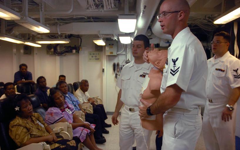 Keywords: US Navy 050826-N-3455P-012 Hospital Corpsman 2nd Class Aaron L. Giacoletti talks to citizens of Majuro about cardiopulmonary resuscitation (CPR) and first aid aboard the amphibious assault ship USS Boxer (LHD 4).jpg en Majuro Marshall Islands Aug 26 2005 - Hospital Corpsman 2nd Class Aaron L Giacoletti talks to citizens of Majuro about cardiopulmonary resuscitation CPR and first aid aboard the amphibious assault ship USS Boxer LHD 4 Boxer's visit to the island will give the more than 1 200 Sailors and Marines embarked aboard Boxer a chance to conduct a community outreach program and experience Marshallese culture as well as provide some much-needed assistance in the form of medical aid education construction and repairs to schools and other buildings U S Navy photo by Photographer's Mate Airman Paul Polach RELEASED 2005-08-26 050826-N-3455P-012 Navy http //www navy mil/view_image asp id 27435 U S Navy photo by Photographer's Mate Airman Paul Polach PD-USGov-Military-Navy Majuro Aboard USS Boxer LHD-4 Photos taken with Nikon D2H |