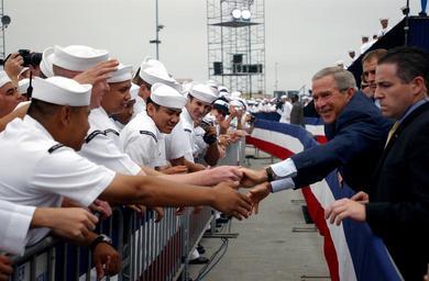 | Keywords: US Navy 050830-N-5549O-138 President George W. Bush pauses to greet and shake hands with San Diego-area Sailors after delivering a speech commemorating the 60th anniversary of the allied victory over Japan (V-J Day).jpg en Coronado Calif Aug 30 2005 - President George W Bush pauses to greet and shake hands with San Diego-area Sailors after delivering a speech commemorating the 60th anniversary of the allied victory over Japan V-J Day during World War II The ceremony was held on board Naval Air Station North Island U S Navy photo by Photographer's Mate 3rd Class Kevin S O'Brien RELEASED 2005-08-30 050830-N-5549O-138 Navy http //www navy mil/view_image asp id 27522 U S Navy photo PD-USGov-Military-Navy Guests at Naval Air Station North Island Handshakes involving the military George W Bush shaking hands Sailors from the United States Navy George W Bush in 2005 World War II commemoration |
