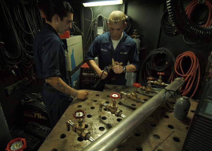 | Keywords: US Navy 050902-N-4308O-004 Hull Technician Fireman Steven Irwin, left, and Hull Technician Fireman Chance Brooks weld stanchions to a potable fresh water manifold in the Machine Shop aboard the Nimitz-class aircraft carrier USS.jpg en Atlantic Ocean Sept 2 2005 - Hull Technician Fireman Steven Irwin left and Hull Technician Fireman Chance Brooks weld stanchions to a potable fresh water manifold in the Machine Shop aboard the Nimitz-class aircraft carrier USS Harry S Truman CVN 75 The potable fresh water manifold will be used to distribute drinking water for hurricane relief efforts in the Gulf Coast Truman will serve as the command center and afloat staging base in the waters off the Gulf Coast The Navy's involvement in the humanitarian assistance operations is led by the Federal Emergency Management Agency FEMA in conjunction with the Department of Defense U S Navy photo by Photographer's Mate 3rd Class Ryan O'Connor RELEASED 2005-09-02 050902-N-4308O-004 Navy http //www navy mil/view_image asp id 27685 U S Navy photo by Photographer's Mate 3rd Class Ryan O'Connor PD-USGov-Military-Navy Aboard USS Harry S Truman CVN-75 Manifolds |