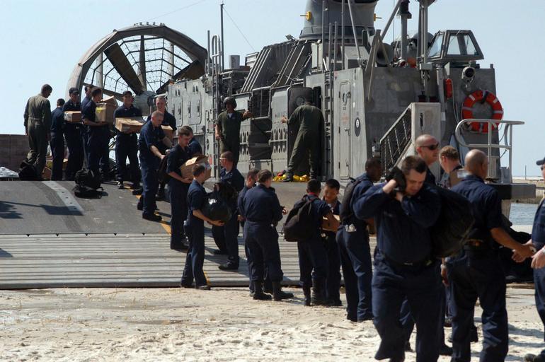 Keywords: US Navy 050909-N-0793G-004 U.S. Navy Sailors assigned to the amphibious dock landing ship USS Whidbey Island (LSD 41) unload supplies brought ashore by a Landing Craft, Air Cushion (LCAC).jpg en Biloxi Miss Sept 9 2005 U S Navy Sailors assigned to the amphibious dock landing ship USS Whidbey Island LSD 41 unload supplies brought ashore by a Landing Craft Air Cushion LCAC in support of the Hurricane Katrina relief efforts Sailors are being brought to the beach to support the mission and are doing relief work such as distribution cleanup and restoration The Navy s involvement in the Hurricane Katrina humanitarian assistance operations is led by the Federal Emergency Management Agency FEMA in conjunction with the Department of Defense U S Navy photo by Journalist 3rd Class Chris Gethings RELEASED 2005-09-09 050909-N-0793G-004 Navy http //www navy mil/view_image asp id 28036 U S Navy photo by Journalist 3rd Class Chris Gethings PD-USGov-Military-Navy Images from US Navy location BILOXI Miss Hurricane Katrina aftermath in Biloxi Aboard USS Whidbey Island LSD-41 LCAC-8 ship 1987 |