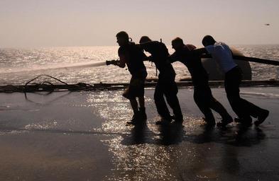 | Keywords: US Navy 050914-N-1416P-052 Sailors man a fire hose during a scrub exercise on the flight deck aboard the nuclear-powered aircraft carrier USS Nimitz (CVN 68).jpg en Persian Gulf Sept 14 2005 - Sailors man a fire hose during a scrub exercise on the flight deck aboard the nuclear-powered aircraft carrier USS Nimitz CVN 68 The Nimitz Strike Group is currently on a regularly scheduled deployment and is participating in Maritime Security Operations MSO MSO set the conditions for security and stability in the maritime environment as well as complement the counter-terrorism and security efforts of regional nations U S Navy photo by Photographer s Mate Airman Natalia E Panetta RELEASED 2005-09-14 050914-N-1416P-052 Navy http //www navy mil/view_image asp id 28229 U S Navy photo by Photographer s Mate Airman Natalia E Panetta PD-USGov-Military-Navy Aboard USS Nimitz CVN-68 |