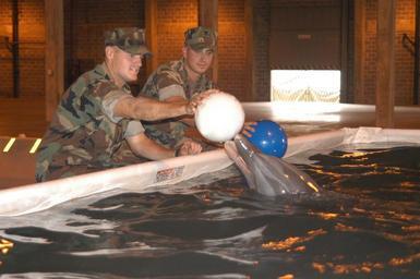| Keywords: US Navy 050917-N-0793G-001 Dolphins placed in a temporary saltwater pool facility at the Naval Construction Battalion Center Gulfport.jpg en Gulfport Miss Sept 17 2005 - Ens Michael Dobling left and Master-at-Arms 3rd Class Philip Myers welcomes one of four Atlantic Bottlenose Dolphins displaced when hurricane Katrina destroyed their home at the Marine Life Oceanarium in Gulfport Miss The dolphins are being placed in a temporary saltwater pool facility at the Naval Construction Battalion Center Gulfport U S Navy Marine Mammal Program personnel from San Diego Calif provided the aboveground facility along with other necessary filtration equipment needed to care for sea mammals The dolphins spent the last two and a half weeks in the Gulf of Mexico swept out to sea by a wave reported to be forty feet high during Hurricane Katrina Because these dolphins are from a captive facility they do not forage for food or necessarily have the survival skills needed to avoid predators or boat traffic Since they were spotted off the gulf coast on Saturday Sept 10 Marine Life Aquarium trainers and National Oceanic Atmospheric Administration NOAA Fisheries Service biologists have been feeding the dolphins several times a day from a NOAA vessel U S Navy photo by Journalist 3rd Class Chris Gethings RELEASED 2005-09-17 050917-N-0793G-001 Navy http //www navy mil/view_image asp id 28294 U S Navy photo by Journalist 3rd Class Chris Gethings PD-USGov-Military-Navy Marine Life Oceanarium Master-at-arms Naval Construction Battalion Center Gulfport United States Navy Marine Mammal Program Mammals of Mississippi |