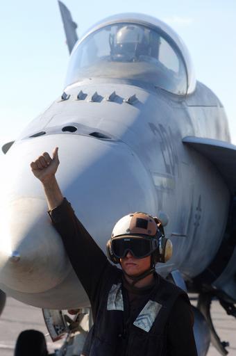 Keywords: US Navy 051019-N-5345W-099 A Plane Captain assigned to the Silver Eagles of Marine Fighter Attack Squadron One One Five (VMFA-115) stands by the nose of his F-A-18A- Hornet signaling that pre-flight checks are complete.jpg en Atlantic Ocean Oct 19 2005 - A Plane Captain assigned to the Silver Eagles of Marine Fighter Attack Squadron One One Five VMFA-115 stands by the nose of his F/A-18A+ Hornet signaling that pre-flight checks are complete prior to flight operations aboard the Nimitz-class aircraft carrier USS Harry S Truman CVN 75 Truman is currently conducting carrier qualifications and sustainment training with embarked Carrier Air Wing Three CVW-3 off the East Coast U S Navy photo by Photographer's Mate 3rd Class Kristopher Wilson RELEASED 2005-10-19 051019-N-5345W-099 Navy http //www navy mil/view_image asp id 29156 U S Navy photo by Photographer's Mate 3rd Class Kristopher Wilson PD-USGov-Military-Navy Aboard USS Harry S Truman CVN-75 Pre-flight checks USMC |