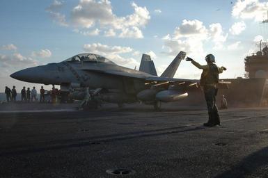 Keywords: US Navy 051102-N-9389D-110 Flight deck personnel motion for an F-A-18F Super Hornet to prepare for launch.jpg en Pacific Ocean Nov 2 2005 - Flight deck personnel motion for an F/A-18F Super Hornet assigned to the Diamondbacks of Strike Fighter Squadron One Zero Two VFA-102 to prepare for launch from the flight deck of the conventionally powered aircraft carrier USS Kitty Hawk CV 63 U S Navy photo by Photographer's Mate Airman Benjamin Dennis RELEASED 2005-11-02 051102-N-9389D-110 Navy http //www navy mil/view_image asp id 29628 U S Navy photo by Photographer's Mate Airman Benjamin Dennis PD-USGov-Military-Navy Aboard USS Kitty Hawk CV-63 Photographs by Benjamin Dennis Strike Fighter Squadron 102 United States Navy |