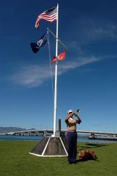 Keywords: US Navy 051114-N-3019M-004 U.S. Marine Corps Sgt. Louis Magana echoes taps on his bugle during a ceremony dedicating a new flagstaff and display of bronze plaques.jpg en Pearl Harbor Hawaii Nov 14 2005 - U S Marine Corps Sgt Louis Magana echoes taps on his bugle during a ceremony dedicating a new flagstaff and display of bronze plaques commemorating 73 Marines who gave their lives and 15 survivors of the attack on the battleship USS Arizona at Pearl Harbor Dec 7 1941 The memorial features the names of the 88 Marines stationed aboard Arizona during the attack a piece of steam pipe from Arizona's original hull the National Ensign the U S Navy and U S Marine Corps flag U S Navy photo by Journalist 3rd Class Ryan C McGinley RELEASED 2005-11-14 051114-N-3019M-004 Navy http //www navy mil/view_image asp id 30039 U S Navy photo by Journalist 3rd Class Ryan C McGinley PD-USGov-Military-Navy 2005 in Pearl Harbor Taps bugle call |