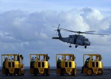 | Keywords: US Navy 051115-N-9742R-003 Supply Department personnel standby in forklifts to move pallets of food and cargo.jpg en Atlantic Ocean Nov 15 2005 - Supply Department personnel standby in forklifts to move pallets of food and cargo being delivered by an HH-60H Seahawk assigned to the Dragonslayers of Helicopter Anti-Submarine Squadron Eleven HS-11 during a vertical replenishment Enterprise and embarked Carrier Air Wing One CVW-1 are currently underway conducting Tailored Ship's Training Availability TSTA U S Navy photo by Photographer's Mate 3rd Class Milosz Reterski RELEASED 2005-11-15 051115-N-9742R-003 Navy http //www navy mil/view_image asp id 29982 U S Navy photo by Photographer's Mate 3rd Class Milosz Reterski PD-USGov-Military-Navy Images from US Navy location ATLANTIC OCEAN HH-60H Rescue Hawk Military forklifts Helicopter Anti-Submarine Squadron 11 United States Navy |