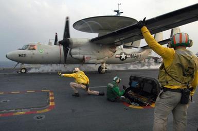 Keywords: US Navy 051129-N-8604L-040 Catapult shooters signal to launch an E-2C Hawkeye.jpg en Pacific Ocean Nov 29 2005 Catapult shooters signal to launch an E-2C Hawkeye assigned to the Liberty Bells of Carrier Airborne Early Warning Squadron One One Five VAW-115 off the flight deck of the conventionally powered aircraft carrier USS Kitty Hawk CV 63 during cyclic flight operations Kitty Hawk and embarked Carrier Air Wing Five CVW-5 are currently conducting operations in the Western Pacific Ocean U S Navy photo by Photographer's Mate Airman Joshua Wayne LeGrand RELEASED 2005-11-29 051129-N-8604L-040 Navy http //www navy mil/view_image asp id 30318 U S Navy photo by Photographer's Mate Airman Joshua Wayne LeGrand PD-USGov-Military-Navy Aboard USS Kitty Hawk CV-63 Northrop Grumman E-2C Hawkeye aircraft carrier take-offs Airborne Early Warning Squadron 115 United States Navy |